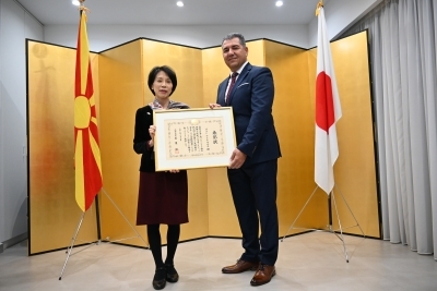 Photo Gallery 18-тa Недела на јапонски филм/ Java e 18-të e Filmit Japonez/ The 18th Japanese Film Festival Церемонија за доделување на признание од Министерот за надворешни работи на г. Горан Антевски, претседател на Македонската AOTS Алумни асоцијација/ Ceremonia e dhënies së Mirënjohjes nga Ministri i Punëve të Jashtme për z. Goran Antevski, President i Shoqatës së Ish-Nxënësve të AOTS në Maqedoninë e Veriut/ Awarding Ceremony of Foreign Minister’s Commendation to Mr. Goran Antevski, President, the Macedonian AOTS Alumni Association Нихон Минјо концерт/ Koncerti Nihon Min’jo/ Nihon Minyo Concert Посета на амбасадорката Кавахара на ЈНУ Хидробиолошкиот институт/ Vizita e ambasadores Kavahara në Institutin Hidrobiologjik PSI/ Ambassador Kawahara’s visit to the PSI Hydrobiological Institute Церемонија за потпишување на грантот за „Проектот за набавка на ехо апарат за ЈЗУ Здравствен дом Крушево“/ Ceremonia e Nënshkrimit të Grantit për “Projektin për furnizimin me pajisje të ultrazërit për Qendrën Shëndetësore në Krushevë PHI”/ GGP Signing Ceremony for the “Project for the Provision of an Ultrasound System for PHI Health Center Krushevo” Амбасадорката Кавахара оствари протоколарна средба со г. Славески, гувернер на Народната банка/ Takimi protokollar i ambasadores Kavahara me z. Slaveski, guvernator i Bankës Qëndrore/ Ambassador Kawahara pays a courtesy visit to Mr. Slaveski, Governor of the National Bank Протоколарна посета на амбасадорката Кавахара на Агенцијата за странски инвестиции (Invest North Macedonia)/ Vizitë protokollare e Ambasadores Kavahara në Agjencinë për Investime të Huaja (Invest North Macedonia)/ Ambassador Kawahara pays a courtesy visit to Invest North Macedonia Амбасадорката Кавахара оствари протоколарна средба со г.Перински, Министер за локална самоуправа/ Takimi protokollar i ambasadores Kavahara me z. Perinski, Ministër i Vetëqeverisjes lokale/ Ambassador Kawahara pays a courtesy visit to Mr. Perinski, Minister of Local Self-Government What's New go to list 2025/11/24 18-тa Недела на јапонски филм/ Java e 18-të e Filmit Japonez/ The 18th Japanese Film Festival 2025/11/21 Церемонија за доделување на признание од Министерот за надворешни работи на г. Горан Антевски, претседател на Македонската AOTS Алумни асоцијација/ Ceremonia e dhënies së Mirënjohjes nga Ministri i Punëve të Jashtme për z. Goran Antevski, President i Shoqatës së Ish-Nxënësve të AOTS në Maqedoninë e Veriut/ Awarding Ceremony of Foreign Minister’s Commendation to Mr. Goran Antevski, President, the Macedonian AOTS Alumni Association 2025/11/8 Нихон Минјо концерт/ Koncerti Nihon Min’jo/ Nihon Minyo Concert 2025/10/17 Посета на амбасадорката Кавахара на ЈНУ Хидробиолошкиот институт/ Vizita e ambasadores Kavahara në Institutin Hidrobiologjik PSI/ Ambassador Kawahara’s visit to the PSI Hydrobiological Institute 2025/10/2 Церемонија за потпишување на грантот за „Проектот за набавка на ехо апарат за ЈЗУ Здравствен дом Крушево“/ Ceremonia e Nënshkrimit të Grantit për “Projektin për furnizimin me pajisje të ultrazërit për Qendrën Shëndetësore në Krushevë PHI”/ GGP Signing Ceremony for the “Project for the Provision of an Ultrasound System for PHI Health Center Krushevo” 2025/9/12 Амбасадорката Кавахара оствари средба со Претседателката Силјановска Давкова/ Vizita e Ambasadores Kavahara te Presidentja Siljanovska Davkova/ Ambassador Kawahara pays a courtesy visit to President Siljanovska Davkova 2025/9/11 Амбасадорката Кавахара оствари протоколарна средба со г. Славески, гувернер на Народната банка/ Takimi protokollar i ambasadores Kavahara me z. Slaveski, guvernator i Bankës Qëndrore/ Ambassador Kawahara pays a courtesy visit to Mr. Slaveski, Governor of the National Bank 2025/9/9 Протоколарна посета на амбасадорката Кавахара на Агенцијата за странски инвестиции (Invest North Macedonia)/ Vizitë protokollare e Ambasadores Kavahara në Agjencinë për Investime të Huaja (Invest North Macedonia)/ Ambassador Kawahara pays a courtesy visit to Invest North Macedonia 2025/9/1 Амбасадорката Кавахара оствари протоколарна средба со г.Перински, Министер за локална самоуправа/ Takimi protokollar i ambasadores Kavahara me z. Perinski, Ministër i Vetëqeverisjes lokale/ Ambassador Kawahara pays a courtesy visit to Mr. Perinski, Minister of Local Self-Government 2025/8/28 Г-н Горан Антевски, претседател на македонското здружение АОТС Алумни ќе прими пофалница од министерот за надворешни работи/ Z. Goran Antevski, President i Shoqatës së Bursistëve të AOTS në Maqedoni, pranon Mirënjohje nga Ministri i Punëve të Jashtme/ Mr. Goran Antevski, President, the Macedonian AOTS Alumni Associat